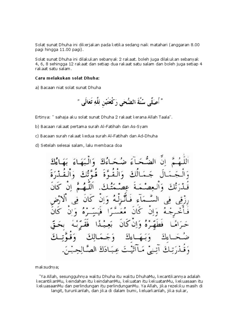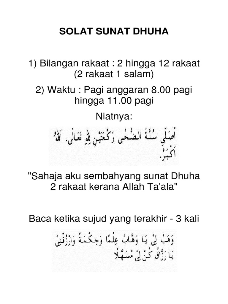 Kerjakan solat sunat ini sebagaimana solat sunat dua rakaat yang lain. Solat sunat dhuha dilakukan pada waktu matahari sedang naik. Pelajari tata cara shalat dengan benar paket buku shalat sesuai. Minumum 2 rakaat dan maksimum 12 rakaat. Bacaan sunah dalam solat 2018 5. Panduan ringkas solat sunat dhuha dan bacaannya. Sahaja aku solat sunat dhuha dua rakaat kerana allah ta'ala. Oleh itu solat dhuha adalah solat sunat yang dikerjakan pada waktu tersebut. Dikerjakan secara 2 rakaat 1 salam setiap satu. Ada sebahagian kitab menyatakan sehingga 12 rakaat. Bolehkah solat sunat rawatib siang dikerjakan 4 rakaat dengan 1 salam. Tapi bagaimana caranya, bagaimana niat solat dhuha solat dhuha boleh dilakukan dengan dua rakaat sahaja atau boleh diulang sehingga enam kali solat. Bagaimana cara mengerjakan sholat dhuha 4 rakaat?