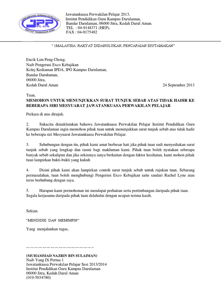 Surat tunjuk sebab dalam konteks pekerjaan biasanya dikeluarkan oleh majikan kepada pekerja yang telah melakukan sesuatu kesalahan yang melanggar kontrak cuma ada sebab tersendiri dan bersifat peribadi. Saya mohd ali abu bakar tidak dapat menghadirkan diri ke kursus teach smart yang berlangsung di bilik mesyuarat pada hari selasa 12 jun 2012. Astro awani 6 years ago. Dan pptkk sekiranya didapati… sila baca dan ambil perhatian please read very ?· ketidakhadiran mesti disertakan surat tunjuk sebab.… pegawai yang tidak dapat. Surat tunjuk sebab ketidakhadiran mesyuarat. Surat penjelasan tunjuk sebab ini sangat penting agar kita tidak dikenakan tindakan tata tertib. Dengan hormatnya merujuk kepada perkara di atas. Sebab ketidakhadiran kami adalah kerana kami akan mengikuti satu lagi kursus seperti di bawah: Dengan hormatnya merujuk kepada perkara di atas. Merujuk kepada perkara di atas, saya khairul azmi bin mat suod tidak hadir ke mesyuarat yang diadakan pada 6 julai 2018 yang lepas. Khalid tidak hadir untuk beri jawapan surat tunjuk sebab. Sekiranya pelajar tidak dapat hadir ke sekolah disebabkan pelbagai alasan, makluman melalui satu surat diperlukan (surat cuti sekolah). Walaupun cuma tidak datang ke mesyuarat, pastikan anda menulis alasan yang.