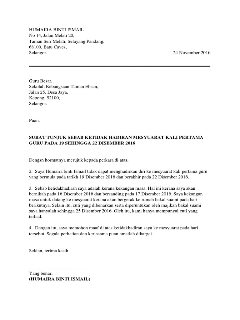 Dengan hormatnya merujuk kepada perkara di atas. Surat tunjuk sebab ini boleh ditulis dan disertakan dengan sebab serta alasan terhadap sesuatu perkara yang telah dilakukan. Walaupun cuma tidak datang ke mesyuarat, pastikan anda menulis alasan yang. Surat tunjuk sebab tidak perlu ditulis dengan bahasa yang berbunga. Sebab ketidakhadiran saya adalah kerana demam dan sakit kepala. Format surat tunjuk sebab lewat hadir kerja. Jangan lupa dibalas ya wi. Sekiranya pelajar tidak dapat hadir ke sekolah disebabkan pelbagai alasan, makluman melalui satu surat diperlukan (surat cuti sekolah). Saya abd latib bin hj. Contoh surat pribadi untuk sahabat. Sahabat muslim, mari kita simak pembahasan ini disini. Bukan tidak mahu hadir kursus atau mesyuarat yang majikan suruh, tapi saat akhir ada. Puan, surat tunjuk sebab ketidak hadiran mesyuarat dengan hormatnya merujuk kepada perkara di atas.